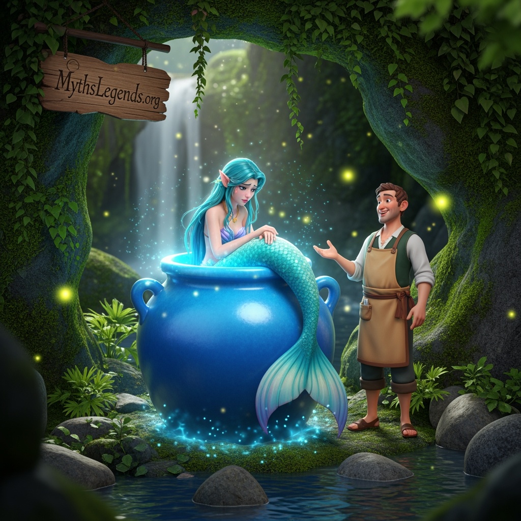 Banished to the Blautopf, the beautiful Lau was condemned to remain there until she could laugh five times. However, given her gloomy disposition, this task seemed almost impossible. It was only when a compassionate innkeeper took an interest in her fate that her situation began to change. Determined to help her, he tried various jokes and humorous interludes to elicit a smile from the melancholic nymph.